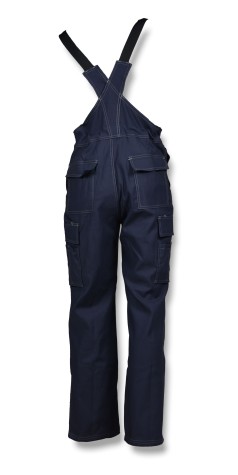 Amerikaanse overall met gulp met ritssluiting, doortasten en sluitingen aan de zijnaad met knoopsluiting.
